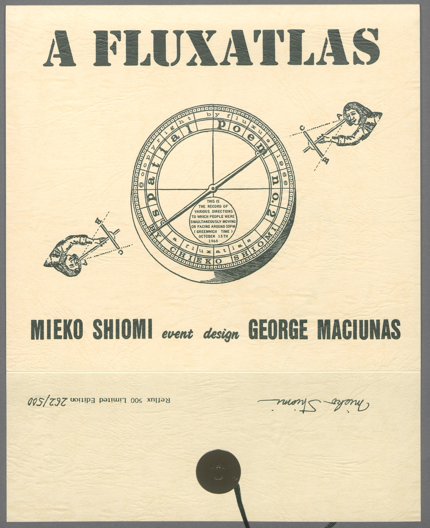 Shiomi, Mieko. A Flux Atlas. Reprint der Karte aus der Fluxus Edition nach einem Entwurf von George Maciunas. 21 x 18,5 cm bzw. 83 x 36,5 cm (aufgeklappt). Illustrierter OUmschlag in Schutzfolie. Mit textilem Schließbändchen. O. O. 1992.