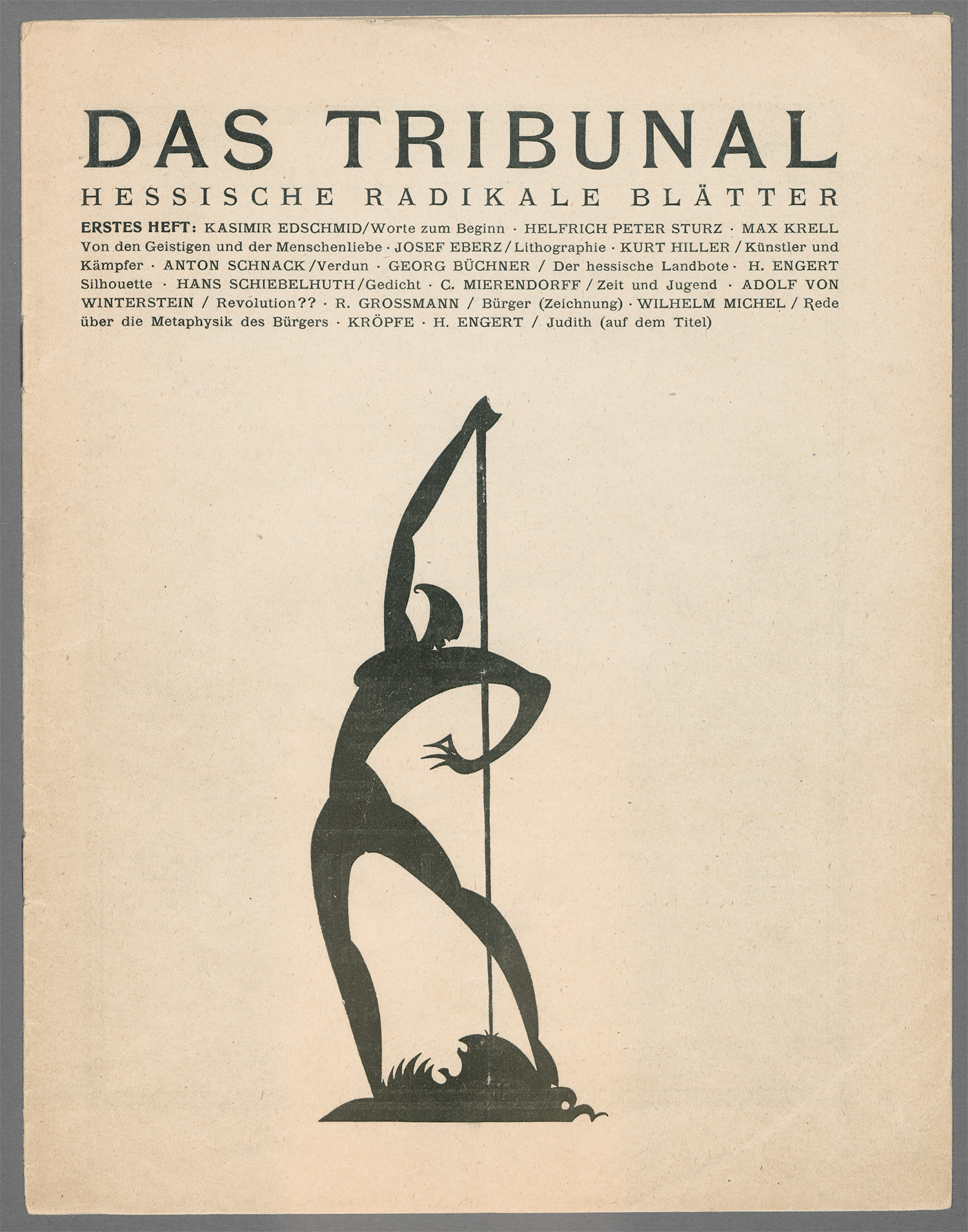 Das Tribunal. Hessische radikale Blätter. Herausgegeben von Carlo Mierendorff. Jg. I, Nr.1-3, 6-12 und Jg. II, Nr. 1-2 in 10 (von 14) Heften. Mit 10 Original-Graphiken (4 auf Umschlägen) und zahlreichen Abbildungen. 28,5 x 22 bis 29,5 x 22,5 cm. OUmschläge (leicht lädiert; 8./9. Heft mit der Bauchbinde "An Frankreich Aufruf an die revolutionäre französische geistige Jugend"). Darmstadt, Die Dachstube, 1919-1920.