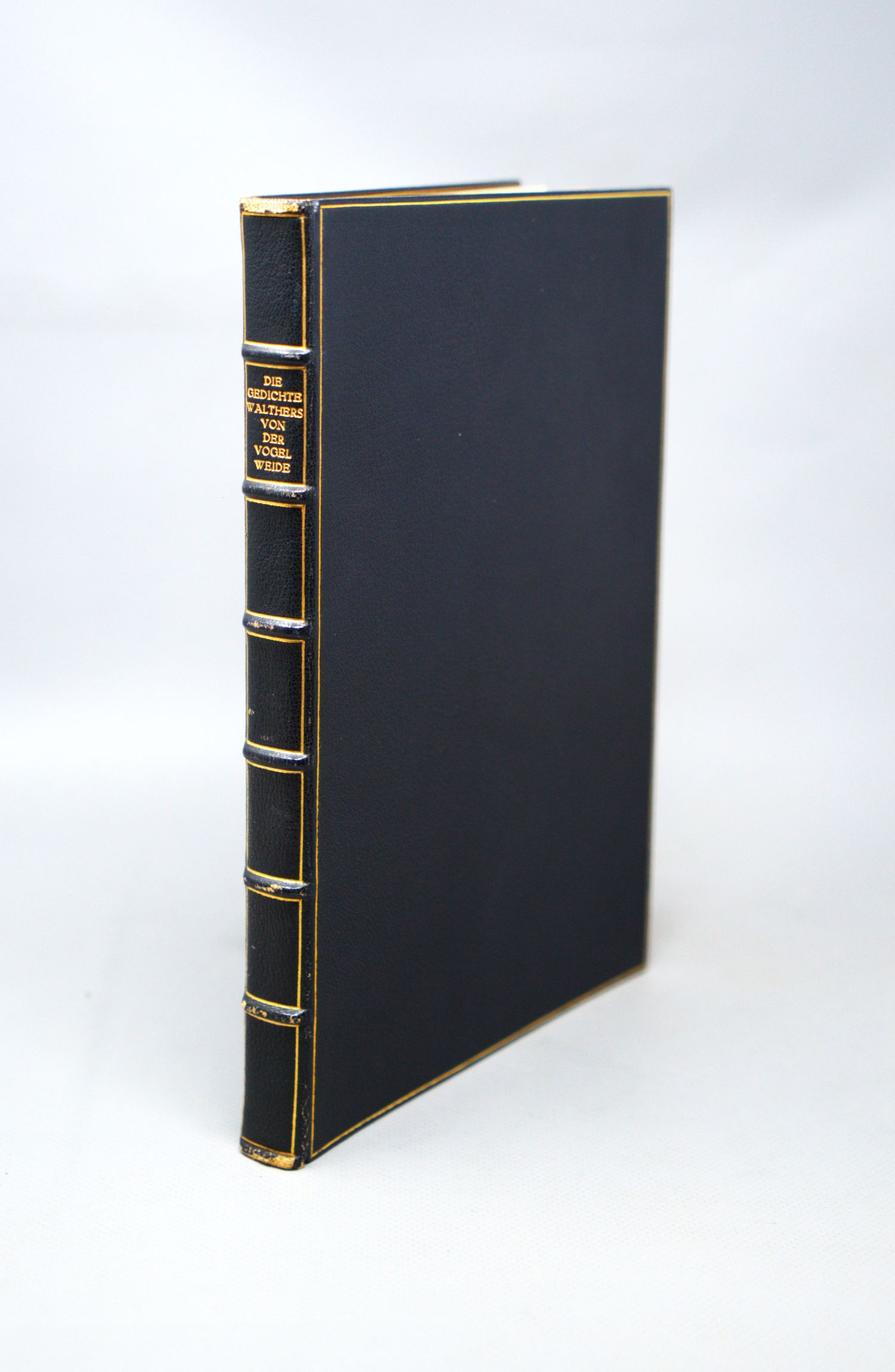 Walther von der Vogelweide. Die Gedichte. 175 S, 4 Bl., 1 w. Bl. 27 x 18,5 cm. Dunkelblauer OChagrinlederband mit vergold. Deckel-. Stehkanten und Innenkantenfileten, RVergoldung und KGoldschnitt. (Leipzig, Insel, 1926).