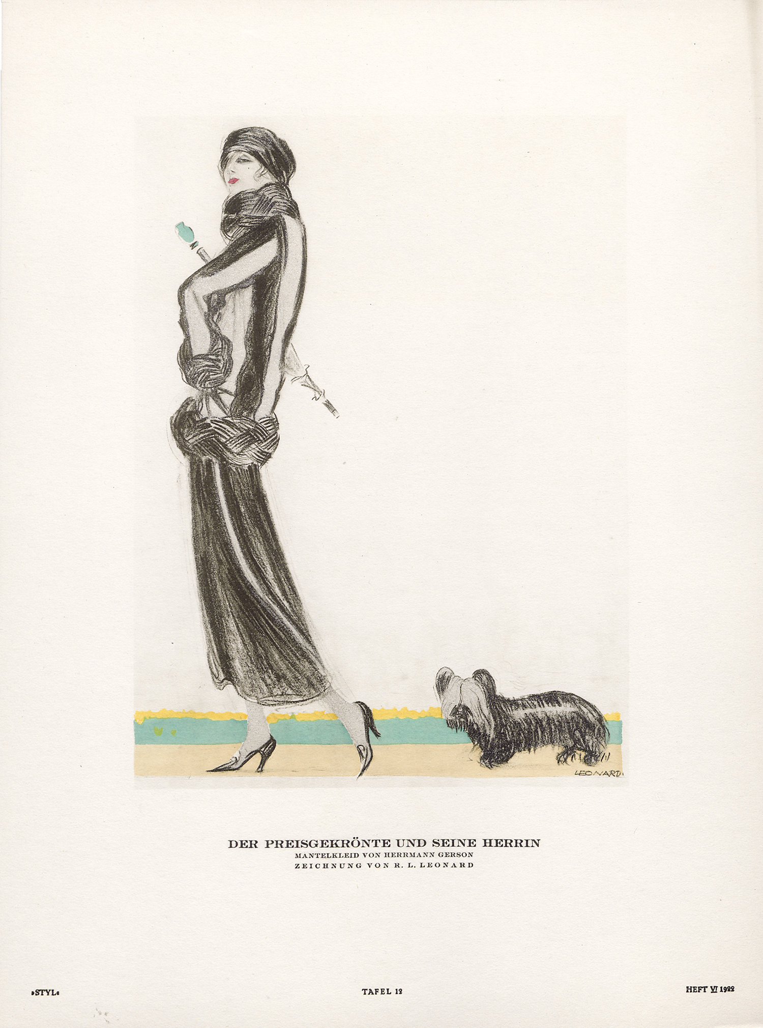 Styl. Blätter für Mode und die angenehmen Dinge des Lebens. Red. von R. L. Leonhard und L. Sternaux. Jg. I, Hefte 1-10 in 7 Heften. Mit 90 überwiegend kolorierten Tafeln und zahlreichen teils ebenfalls kolorierten Textabbildungen. 32 x 24 cm. Lose Blatt und Bogen in OUmschlägen (Heft I in OPergaminumschlag) in OKassette (etwas angestaubt und bestoßen). Berlin 1922.