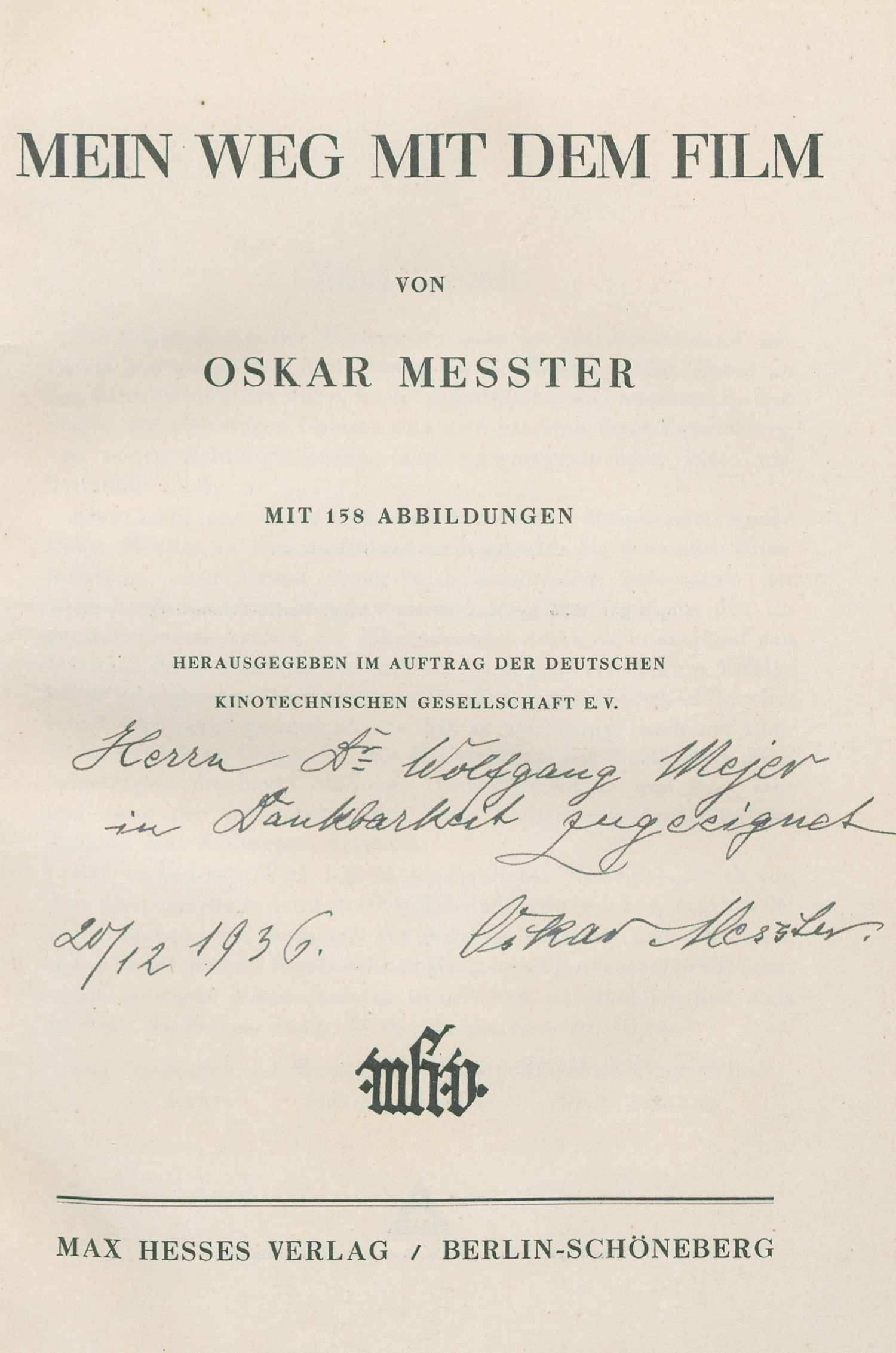Messter, Oskar (d. i. Oskar E. Mester). Mein Weg mit dem Film. Herausgegeben im Auftrag der Deutschen Kinotechnischen Gesellschaft e.V. VIII, 150 S., 1 Bl. Mit 158 Abb. 23 x 15,5 cm. Roter OLeinenband mit goldgepr., Deckel- und RTitel. Berlin-Schöneberg, M. Hesse, 1936.