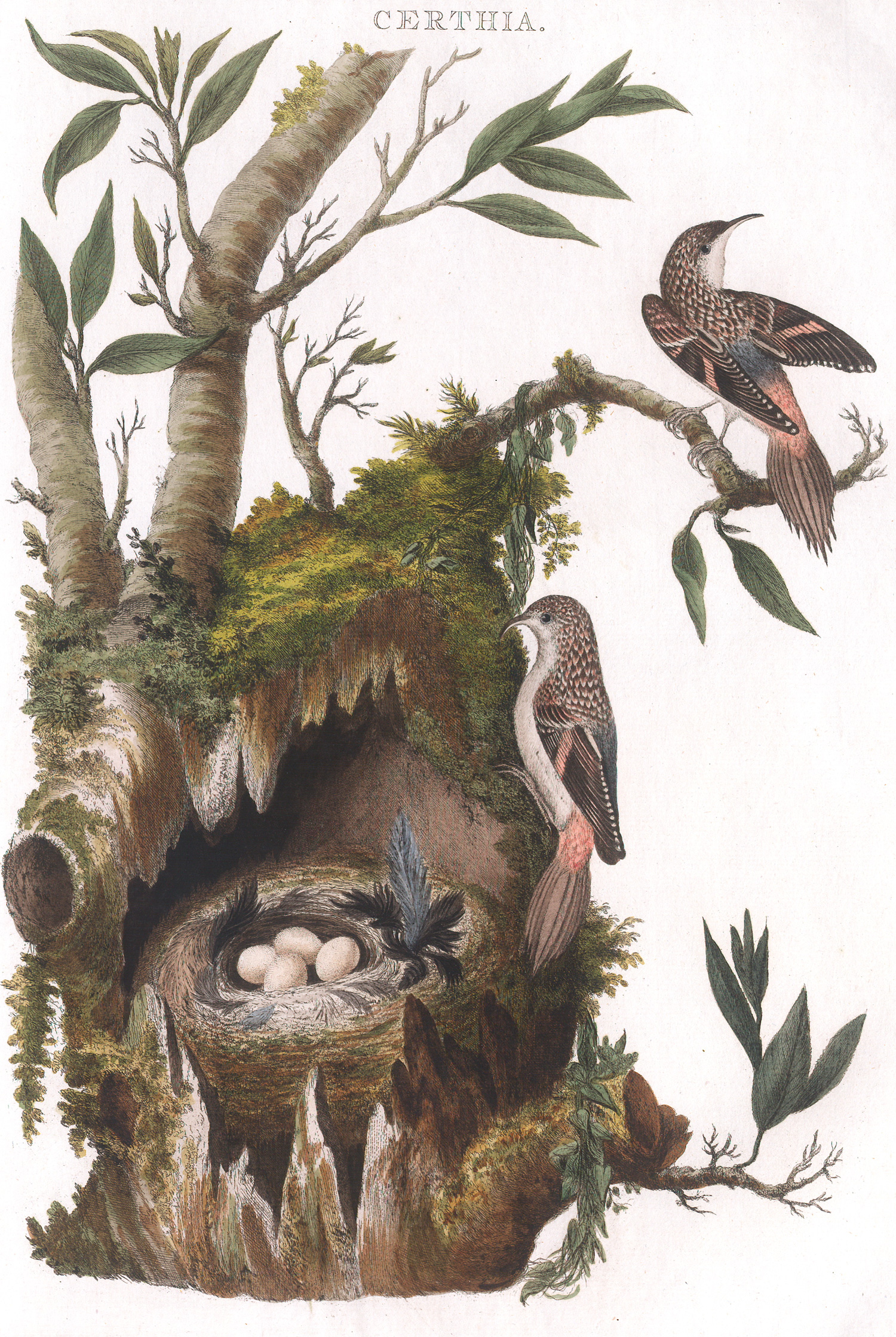Vögel. "Certhia" und "Tringilla, domnestica". 2 kolorierte Kupferstiche. Ca. 42 x 27,5 cm. Unter Glas in einfacher Holzleiste gerahmt. Amsterdam, Sepp und Nozemann, um 1800.