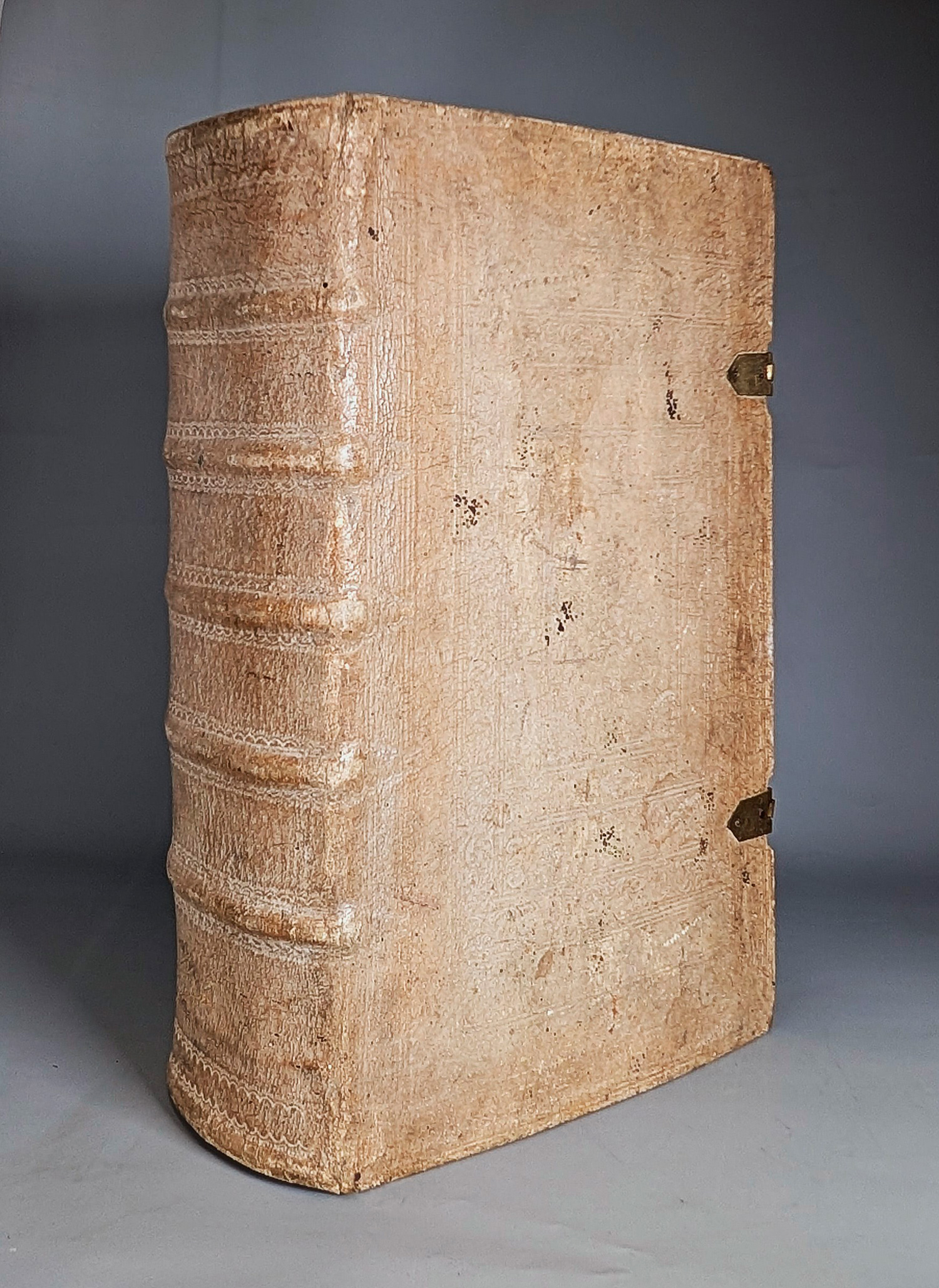 Glorez, Andreas. Neuangeordnete und vollständige Haus- und Land-Bibliothec, worinnen der Bund unverfälschter Wissenschafft zu finden ist ... Deren erstes in sich hält: Die zum Haushalten nöthige Natur- und Kunst-Bücher. In gegenwärtige Ordnung gebracht von Georgio Philippo Platz. Band I (von 2). 6 Bl., 1240 S., 26 Bl. Titel in Schwarz und Rot. Mit 116 (5 doppelblattgroß) Kupfertafeln (ohne das gestochene Frontispiz). 31,5 x 19,5 cm. Blindgeprägter Schweinslederband d. Z. (etwas fleckig und berieben) mit 2 intakten Messingschließen (Beschauzeichen: "NS"). (Nürnberg, J. C. Lochner, 1719).