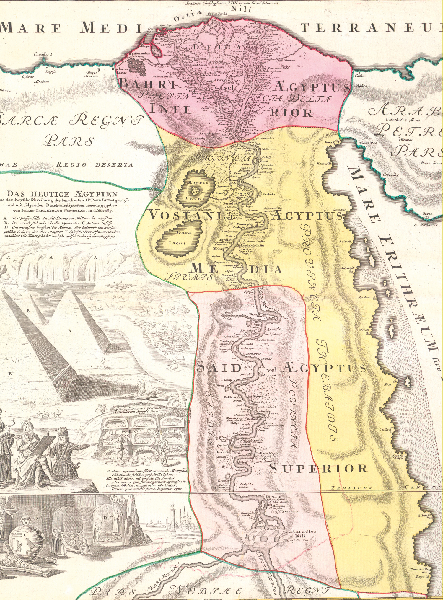 Homann, Johanne Baptista. Aegyptus hodierna. Grenz- und flächenkolorierte Kupferkarte. 59 x 49 cm (Plattenrand) bzw. 64 x 54,5 cm (Blatt). Nürnberg um 1720.
