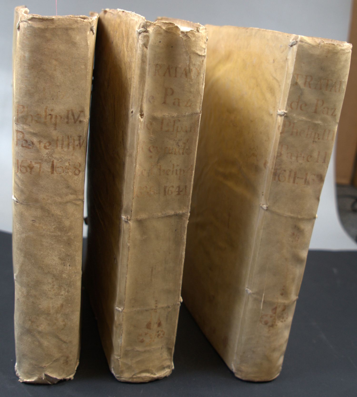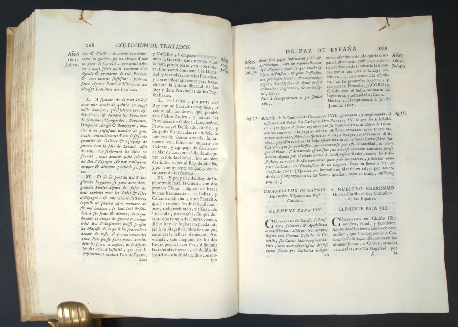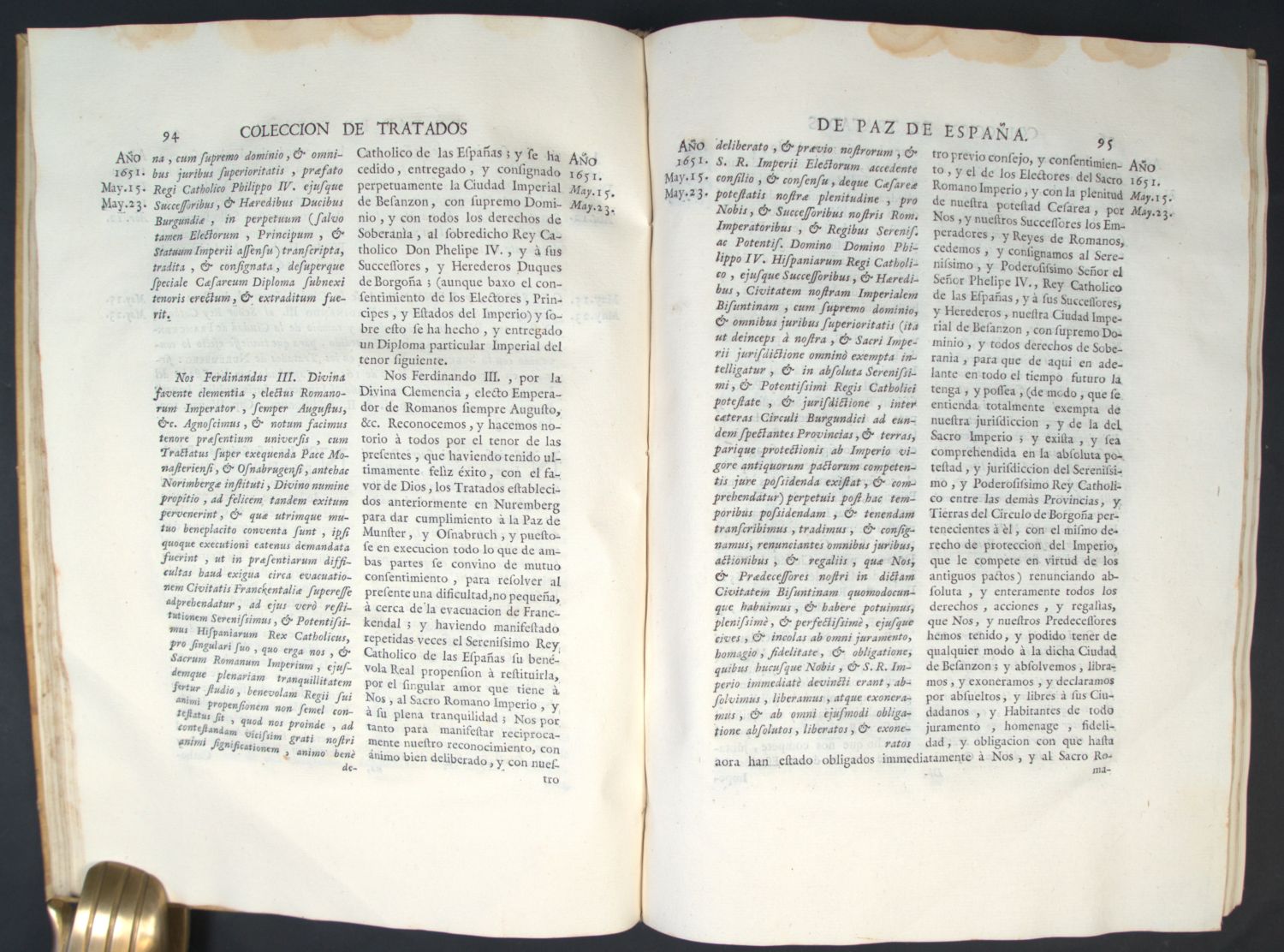 Palau 1010. Colmeiro 1. Nicht bei Einaudi, Goldsmiths, Kress etc. – Erste Ausgabe der monumentalen Sammlung von Verträgen der Spanischen Krone mit ihren Nachbarstaaten und den Kolonien, darunter Friedensverträge, Bündnisverträge, Neutralitätsbekundungen und Garantien zu Krieg und Frieden jeglicher Art, wobei allerdings der Schwerpunkt auf den Handelsverträgen und den diesbezüglichen politischen Abmachungen liegt. Die Sammlung hebt im Jahr 1598 an und geht bis 1665: "En estos ocho volúmenes sen encuentran centenares de documentos transcritos, sobre el comercio y las alianzas políticas efectuadas por los monarcas españoles desde el año 1598 hasta el de 1665, inclusive. La colección completa abarca hasta Carlos II, siendo en total 12 vols. Al estar los documentos clasificados cronologicamente, cada volumen es independiente y correlativo" (beil. Beschr.).