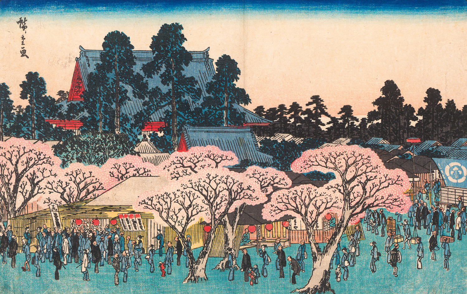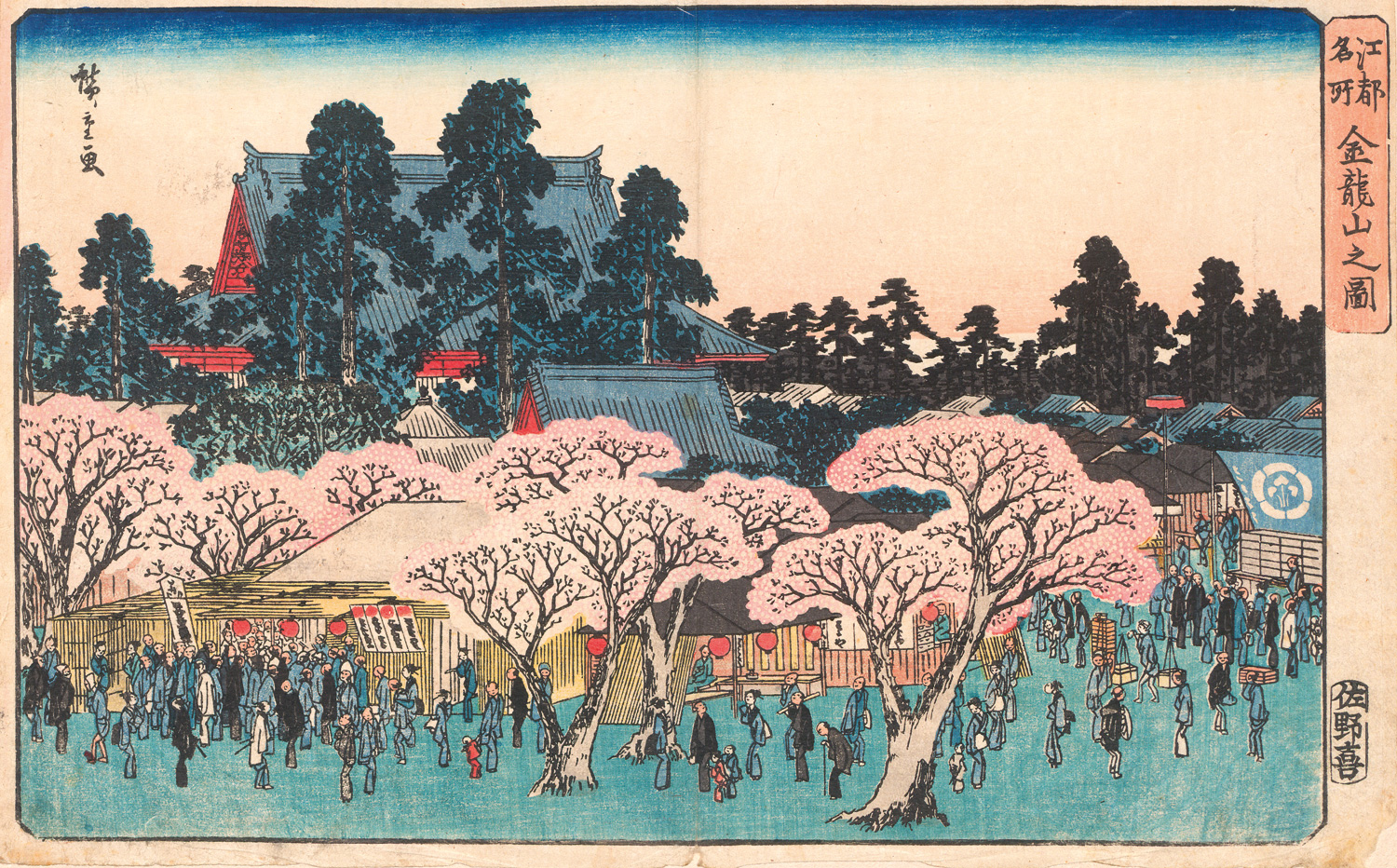 Der Kinryûzan-Tempel (Kinryûzan no zu), der oftmals auch als Kinryûzan-Sensôji bezeichnet wird, ist ein zentrales Motiv in der japanischen Ukiyo-e-Kunst, insbesondere in den Werken des Utagawa Hiroshige (1797-1858), der die Ansicht in seine Reihe "Berühmter Ansichten von Edo" (Kôto meisho) aufnahm. Es handelt sich dabei um den berühmten Sensô-ji in Asakusa (Tokio), den ältesten buddhistischen Tempel der Stadt. – Ränder etwas knittrig, mit Montagespuren und kleinen Fehlstelle (rechte Ecke, unten), Mittelknick leicht gedunkelt, sonst in der Darstellung aber sehr frisch und kaum fleckig, in reizvoller Farbigkeit.