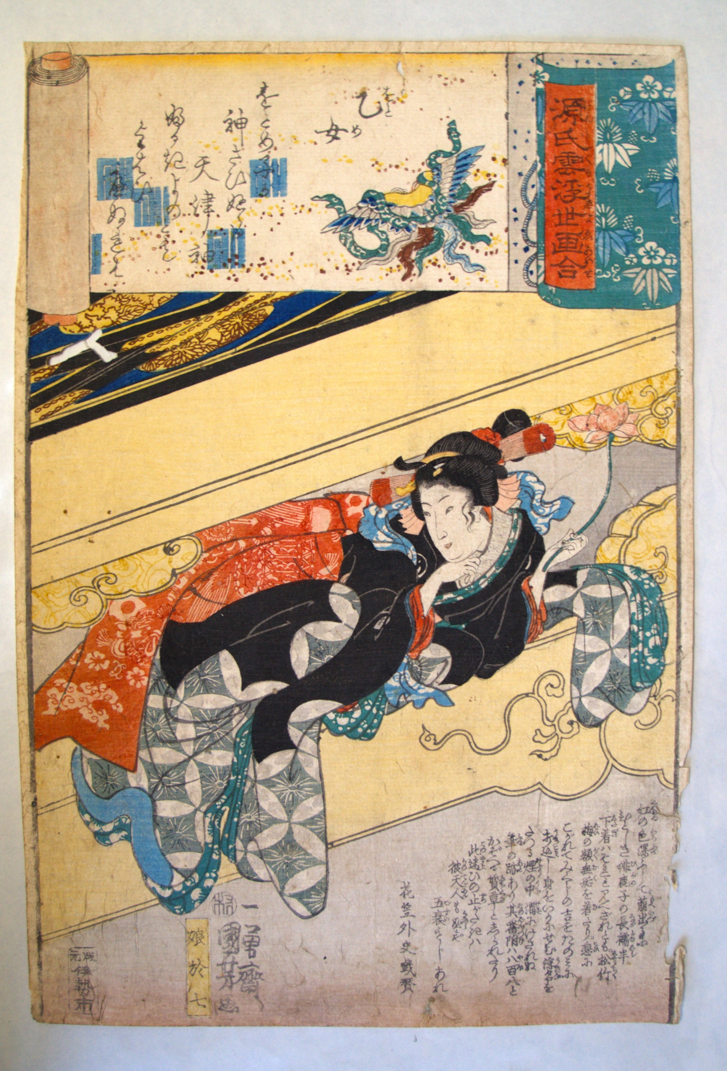 Kuniyoshi, Utagawa. Bilder der vergänglichen Welt. (japonice: "Genji kumo ukiyo-e awase"). Daraus 33 Ukiyo-e Farbholzschnitte der Serie der Darstellungen aus den dunklen Kapiteln der Erzählungen um den Prinzen Genji, signiert "Ichiyûsai Kuniyoshi ga" sowie mit dem roten Kiri-Siegel. Format ôban tata-e. Ca. 34,4 x 23,5 cm. Tokio (Edo), Iseya Ichibê, ca. 1845-1850.