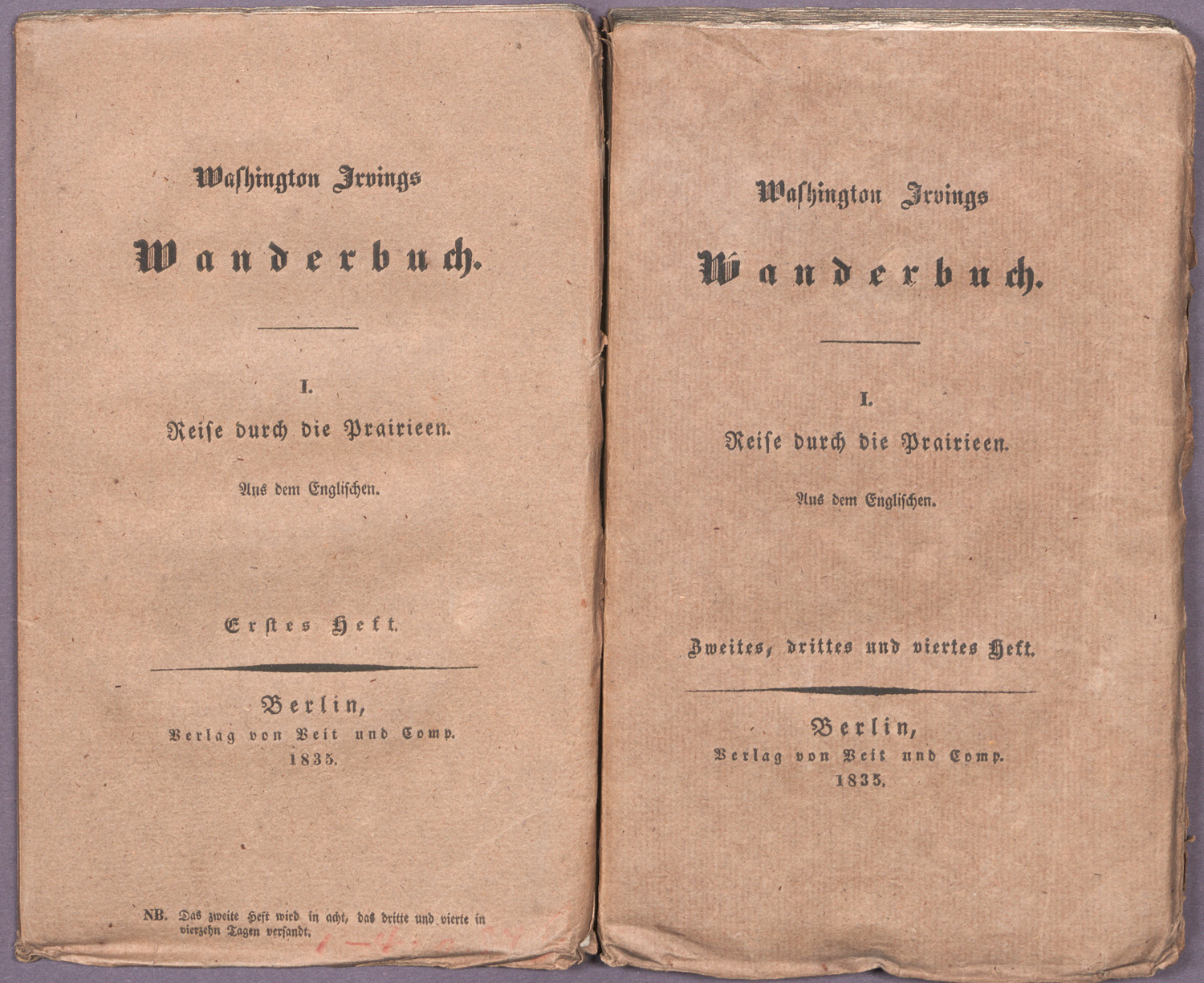 Irving, Washington. Wanderbuch. 2 Bände. 72 S.; 2 Bl., VIII, S. 73-363. 18 x 11 cm. OBroschur (mit Randläsuren und kleinen bis größeren Einrissen) mit DTitel. Berlin, Veit und Comp., 1835.
