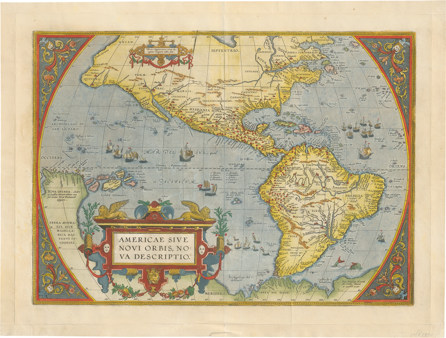 Van den Broecke 11.1. – Die Karte von Nord- und Südamerika von Abraham Ortelius, hier ursprünglich in der lateinischen Ausgabe enthalten, zählte im 16. Jahrhundert zu den wichtigen und häufig gebrauchten Karten. Das Meer wird von zahlreichen Segelschiffen und auch einem Seeungeheuer bevölkert. – Mit Mittelfalz, leicht gebräunt, knickspurig und mit Fehlstelle am unteren Steg.